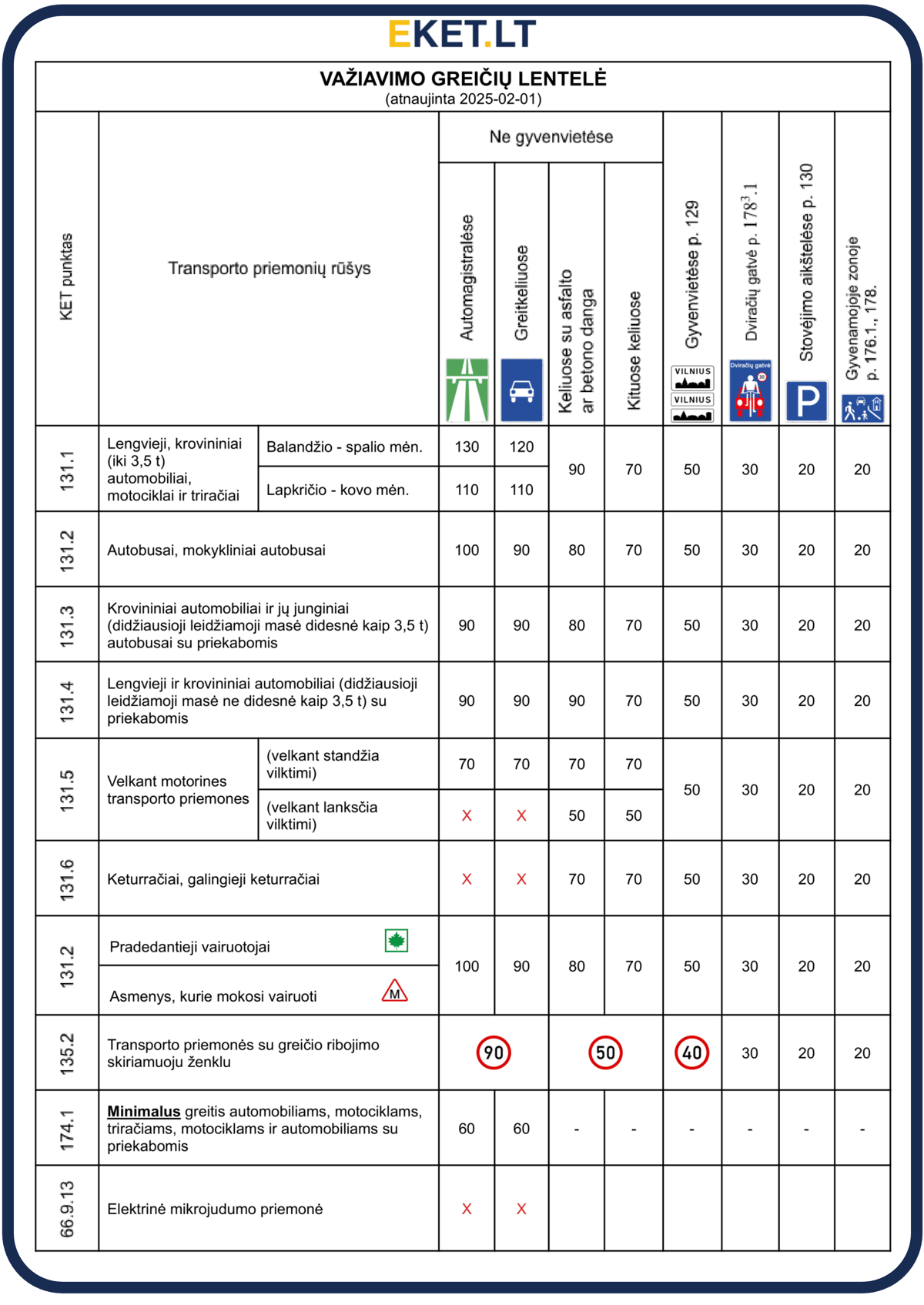 Эта книга — это обновлённая таблица скоростных ограничений 2026 года, составленная в соответствии с официальными Правилами дорожного движения Литвы (КЕТ). В ней чётко и удобно представлены все допустимые скорости в зависимости от типа транспортного средства, категории дороги и времени года — от автомагистралей и скоростных дорог до населённых пунктов и парковок.